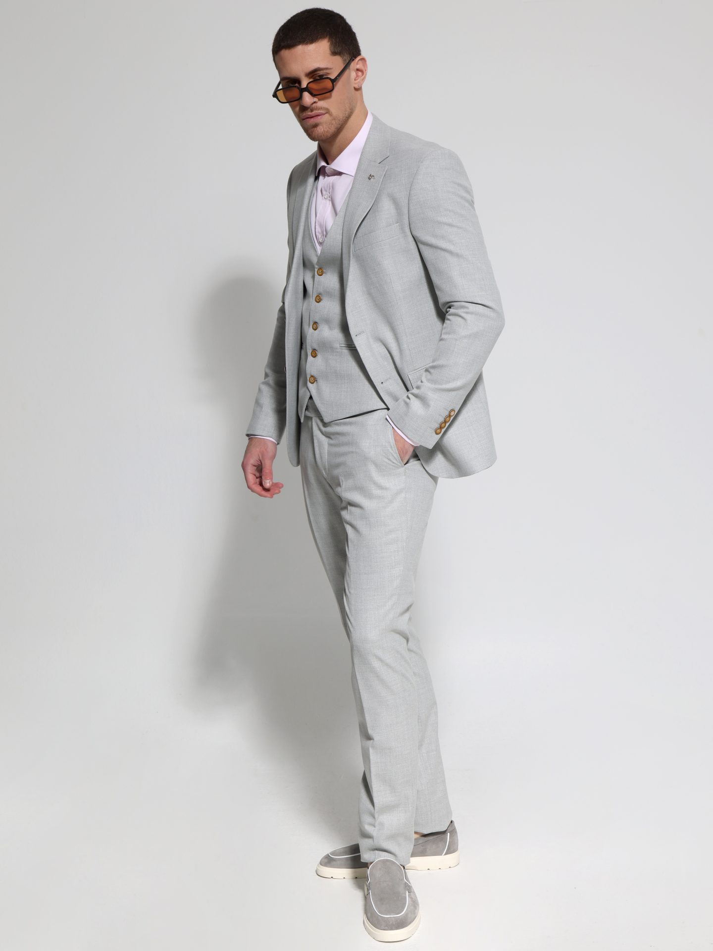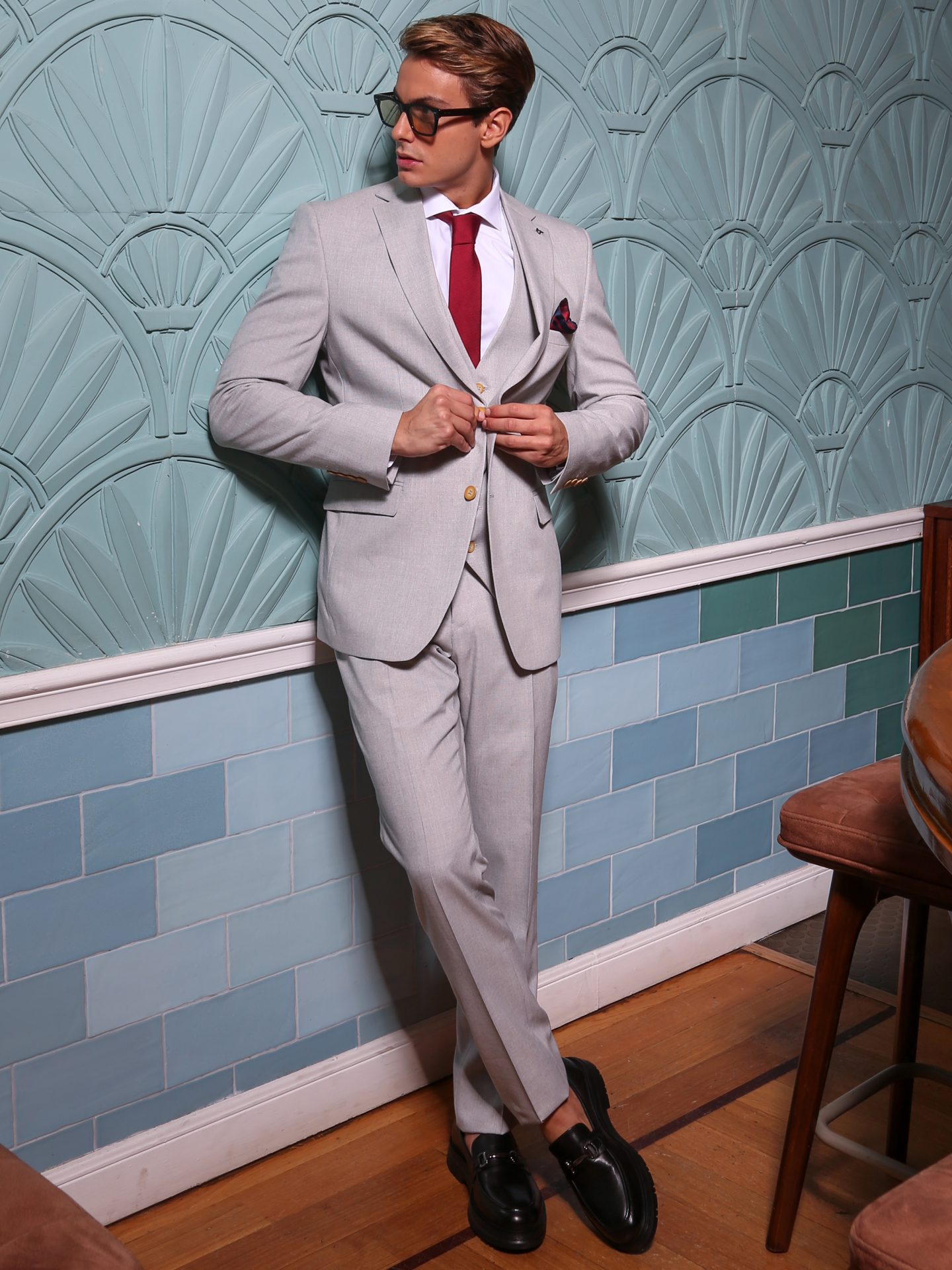 Το γιλέκο κλείνει με κουμπάκια και έχει σφιγκτήρα στο πίσω μέρος για να προσαρμόζεται άψογα στο σώμα σας. Το σακάκι με πέτο κλείνει με κουμπιά μπροστά και διαθέτει δύο τσέπες στα πλάγια, καθώς και μία εσωτερική τσέπη για επιπλέον αποθήκευση. Αυτό το κοστούμι συνδυάζει κομψότητα και λειτουργικότητα, κάνοντάς το απαραίτητο για κάθε ανδρική γκαρνταρόμπα.