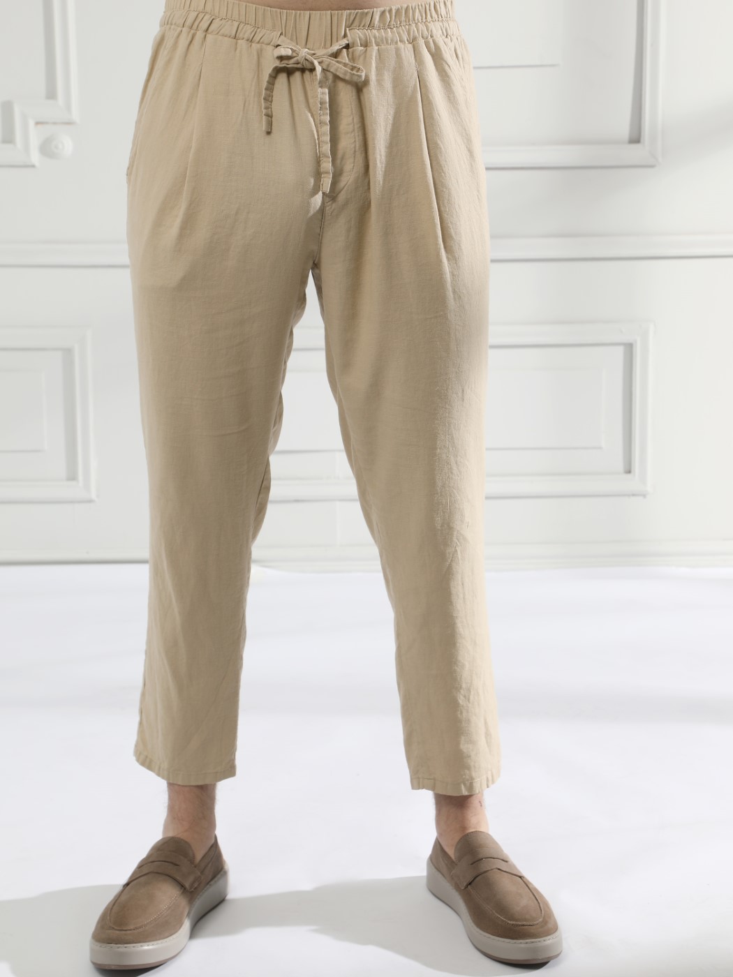 Ανακαλύψτε το ιταλικό σχέδιο αυτού του ανδρικού λινού παντελονιού, που θα σας ενθουσιάσει! Με μήκος 7/8 αστραγάλου και κορδόνι στη μέση, αυτό το παντελόνι είναι ιδανικό για το καλοκαίρι.