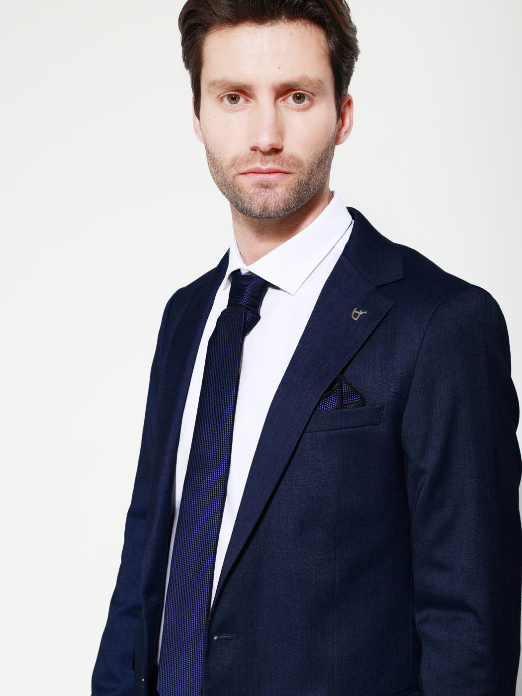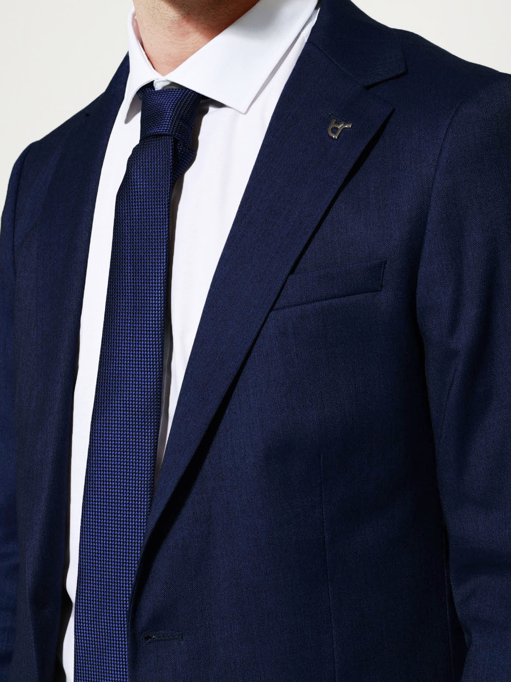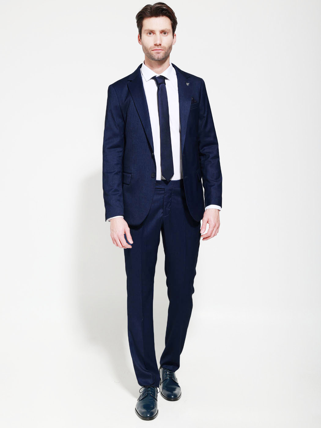 Από εξαιρετικής ποιότητας υλικά. Το σακάκι διαθέτει δύο τσέπες στα πλάγια με καπάκι και μία μικρή κάτω από το πέτο, κλείνει με 2 κουμπιά. Το παντελόνι διαθέτει δύο τσέπες στο πλάι και δύο στο πίσω μέρος, κλείνει με κρυφό φερμουάρ και κουμπί.