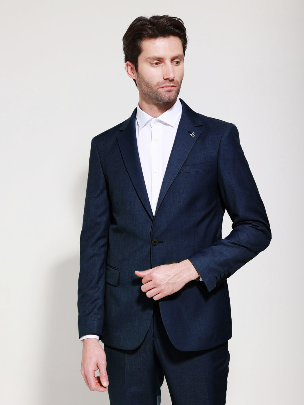 Από εξαιρετικής ποιότητας υλικά. Το σακάκι διαθέτει δύο τσέπες στα πλάγια με καπάκι και μία μικρή κάτω από το πέτο, κλείνει με 2 κουμπιά. Το παντελόνι διαθέτει δύο τσέπες στο πλάι και δύο στο πίσω μέρος, κλείνει με κρυφό φερμουάρ και κουμπί.