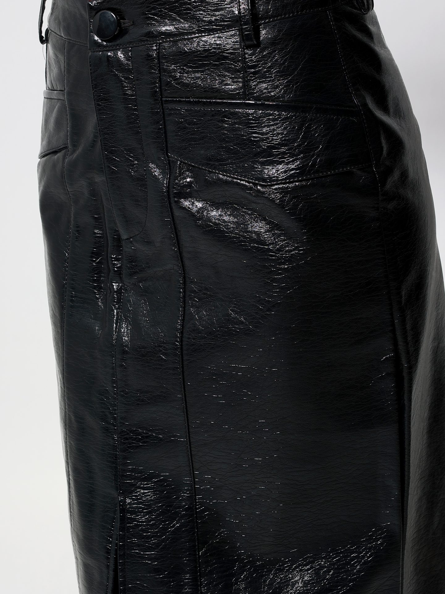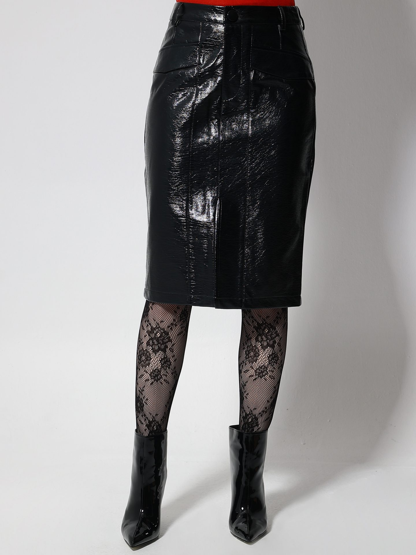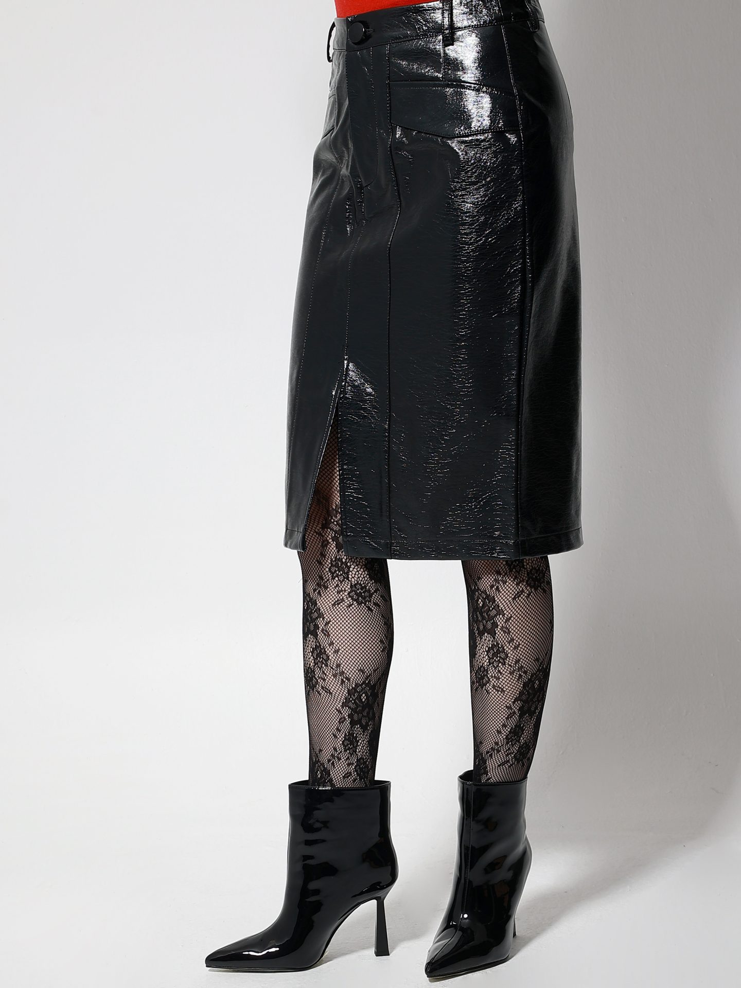 Η μαύρη vinyl pencil φούστα επαναπροσδιορίζει την έννοια της θηλυκής κομψότητας, συνδυάζοντας το κλασικό μήκος με την έντονη λάμψη της δερματίνης. Η ψηλόμεση εφαρμογή της τονίζει τη σιλουέτα, ενώ το midi μήκος της προσδίδει διαχρονική φινέτσα με μία δόση rock δυναμισμού.