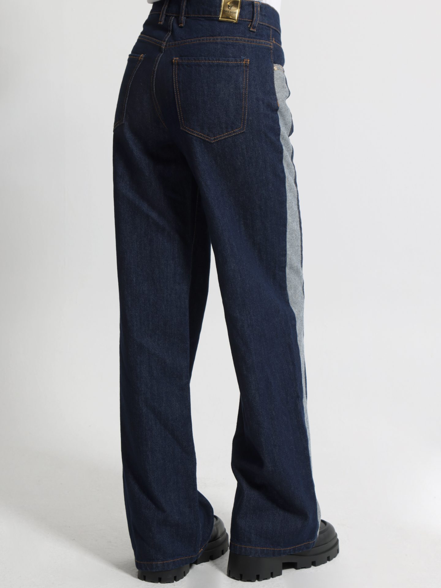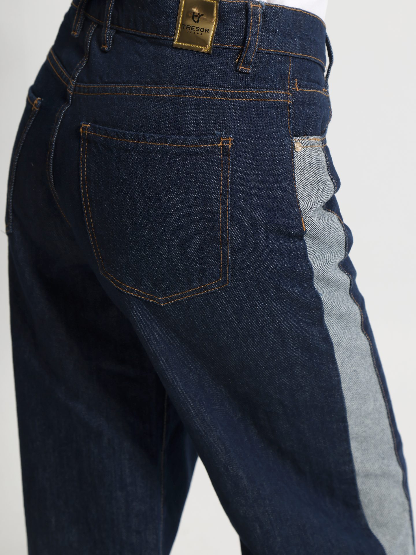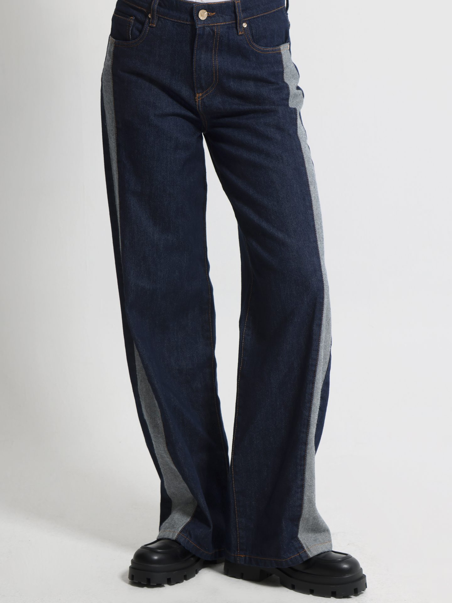 Γυναικείο τζιν παντελόνι σε μοντέρνο σχεδιασμό, ιδανικό για casual και street style εμφανίσεις. Σε σκούρο μπλε denim με ιδιαίτερη λεπτομέρεια από ανοιχτόχρωμο τζιν panel στο πλάι, προσφέρει μια ξεχωριστή αντίθεση που κολακεύει τη σιλουέτα. Διαθέτει κλασική εφαρμογή με πέντε τσέπες, κουμπί και φερμουάρ μπροστά, καθώς και καλοδουλεμένες ραφές που τονίζουν το στυλ του.