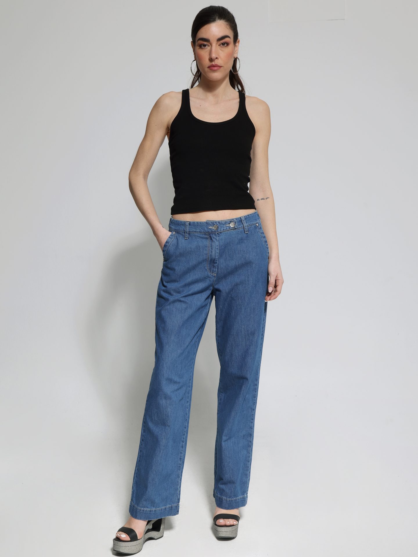 Η γυναικεία jean παντελόνα είναι ιδανική για το καλοκαίρι, καθώς είναι φτιαγμένη από βαμβακερό ύφασμα που εξασφαλίζει άνεση και διαπνοή. Έχει φαρδιά γραμμή, προσφέροντας ελευθερία κινήσεων και άνετη εφαρμογή.