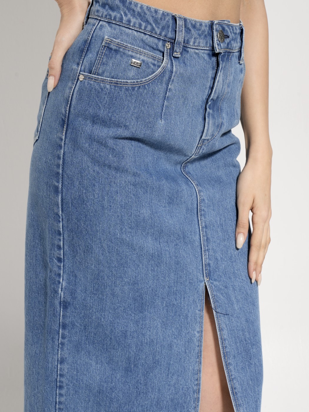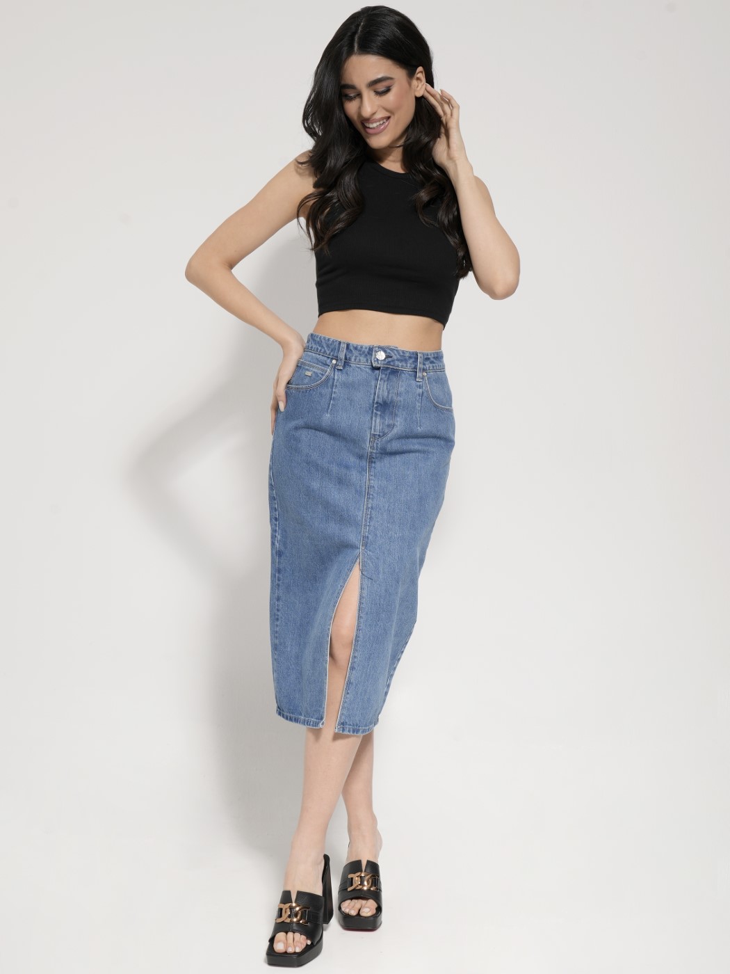 Η denim φούστα διαθέτει μήκος λίγο πιο κάτω από το γόνατο, τέλεια για κάθε περίσταση από το πρωί μέχρι το βράδυ. Το απαλό ύφασμα της θα σας κρατήσει άνετες όλη μέρα. Με την εντυπωσιακή εμφάνισή της, αυτή η φούστα θα γίνει η αγαπημένη σας επιλογή για κάθε εμφάνιση. Συνδυάστε τη με ένα t-shirt για casual εμφανίσεις ή με ένα πουκάμισο για πιο κομψές εξόδους.