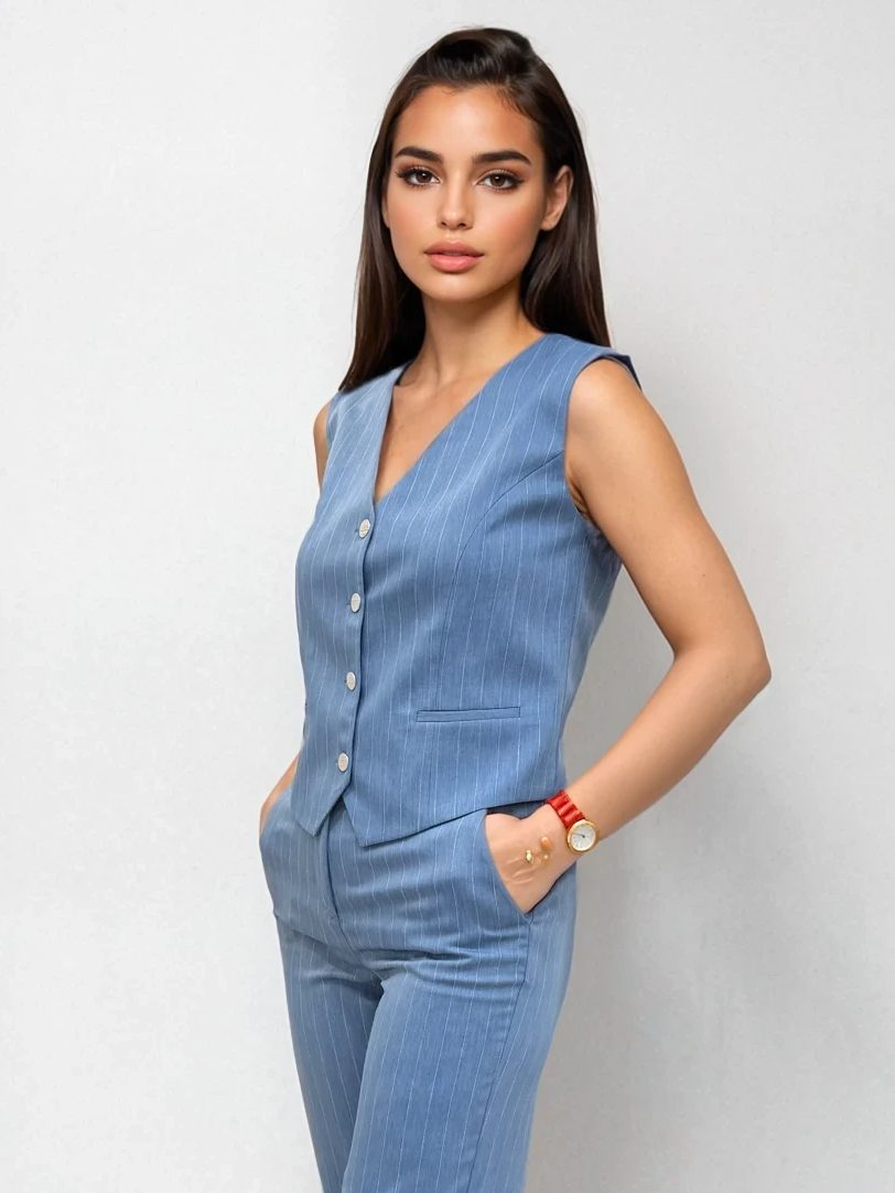 Το γυναικείο γιλέκο αποτελεί ένα απαραίτητο κομμάτι για κάθε γκαρνταρόμπα, συνδυάζοντας στυλ και λειτουργικότητα. Κλείνει με κουμπάκια μπροστά και διαθέτει κρυφές τσέπες, προσφέροντας πρακτικότητα χωρίς να θυσιάζει την κομψότητα. Ο σφιγκτήρας στο πίσω μέρος προσθέτει μια μοντέρνα πινελιά, κάνοντάς το ιδανικό για κάθε περίσταση.