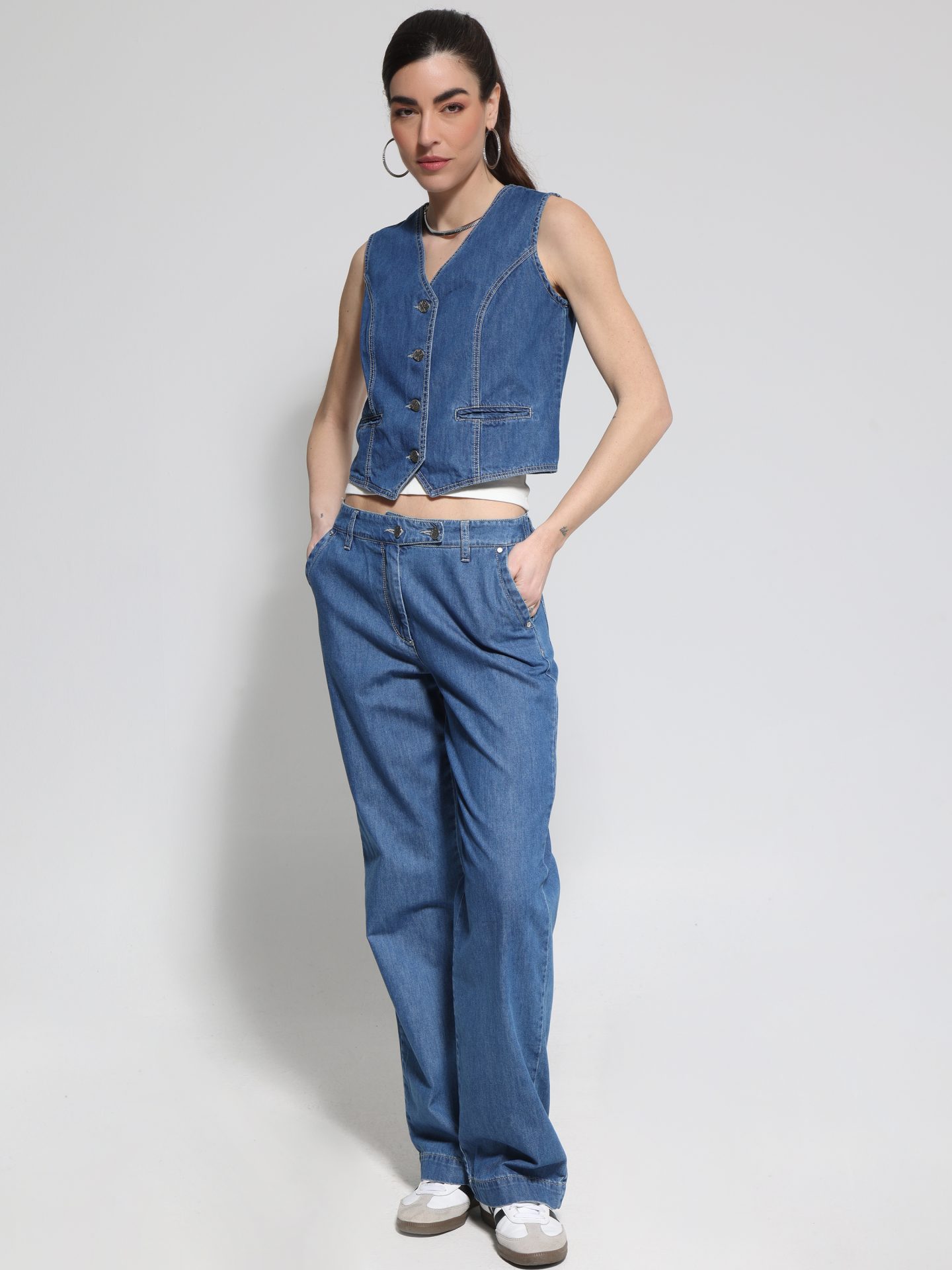 Αυτό το γυναικείο γιλέκο είναι η τέλεια προσθήκη στη ντουλάπα σου! Φτιαγμένο από ποιοτικό jean ύφασμα, προσφέρει άνεση και στυλ σε κάθε εμφάνιση. Το κοντό του μήκος και τα κουμπάκια του το κάνουν ιδανικό για layering ή να το φορέσεις μόνο του με ένα ωραίο μπλουζάκι από κάτω.